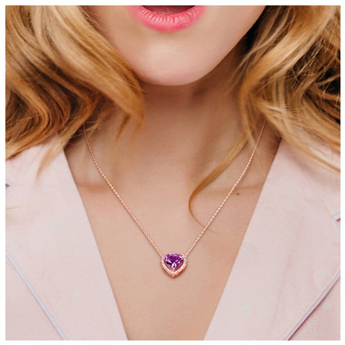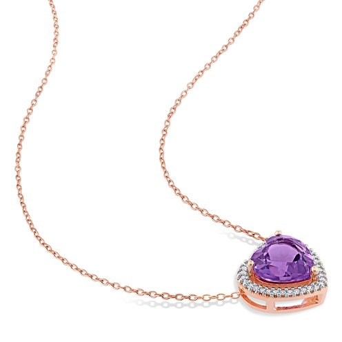 This heart amethyst halo necklace is crafted in rose plated sterling silver and features a heart-cut, prong-set amethyst gemstone at the center of its 36 round-cut white diamonds in a heart motif. Enhanced with a high polish finish, this birthstone pendant is hung on a cable chain and secured with a spring ring clasp. This lovely gemstone and diamond necklace is a stunning addition to any jewelry collection.