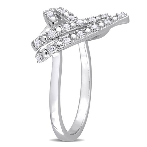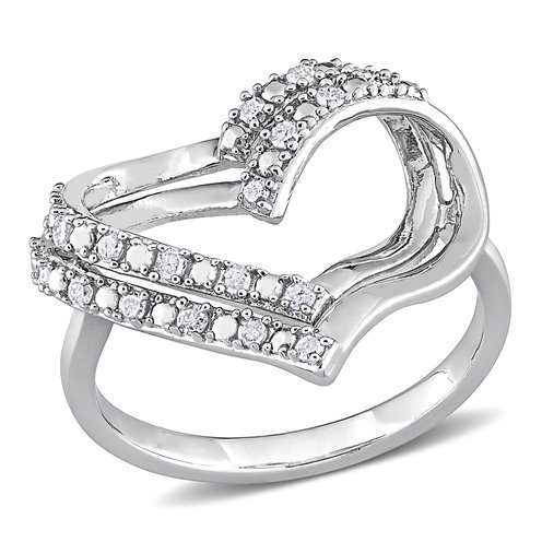 This modern open heart ring is crafted in sterling silver. This fantastic ring features 20 round-cut sparkling diamonds augmented in the double heart pattern. Enhanced with a high polish finish, this diamond fashion ring makes the perfect addition to any jewelry collection. Coordinate this diamond heart ring with any outfit and look gorgeous.