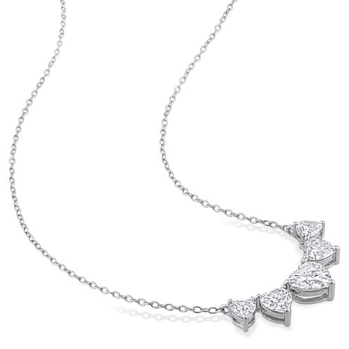This heart moissanite five-stone stationed bar necklace from the is crafted in radiant sterling silver. This classic necklace features five heart-cut, prong-set, created white moissanite gemstones in a unique graduated station bar design, perfect for all occasions