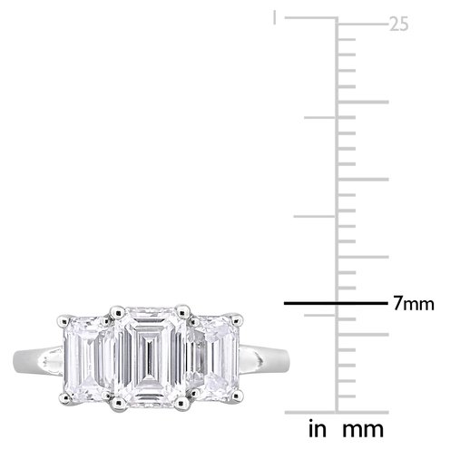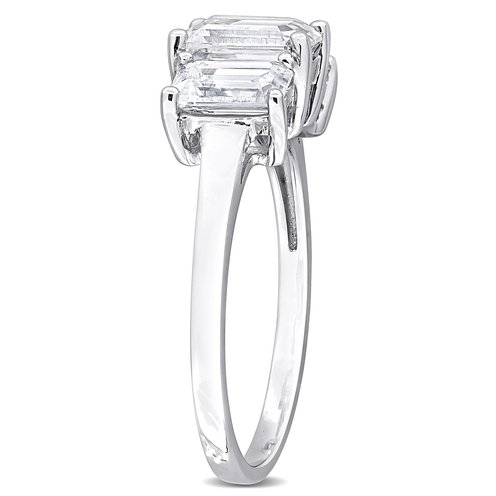 This elegant three-stone engagement ring features a total gem weight of 2 1/5 carats with emerald-cut created moissanite gemstones, set in a sterling silver band. The timeless design and the remarkable brilliance of the moissanite make it a perfect choice for a lasting symbol of love and commitment in an engagement or special occasion. The three-stone arrangement adds extra symbolism, representing the past, present, and future of a relationship.