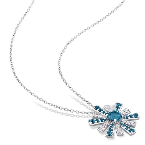 This opulent floral pendant is mounted in shimmering sterling silver. This dainty pendant showcases 25 prong-set, london blue topaz gemstones and 18 prong-set white topaz gemstones. Polished to a brilliant shine, this enchanting pendant is suspended on an 18-inch round cable chain. If you are someone who values premium neckpieces, then this sumptuous pendant is for you.