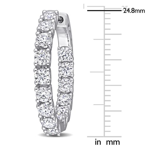 Stock up your jewelry basics with these fashionable Moissanite Inside-Outside Hoop Earrings. Crafted in lustrous sterling silver, they feature 30 round-cut, prong-set flickering created moissanite gemstones (3 x 3mm) placed in an inside-outside pattern around the hoop. Polished to a brilliant shine, these round, moissanite hoop earrings secure with clip-in closures. Adding a metallic shimmer to your appearance, these gemstone earrings pair wears well with apparel of any color.