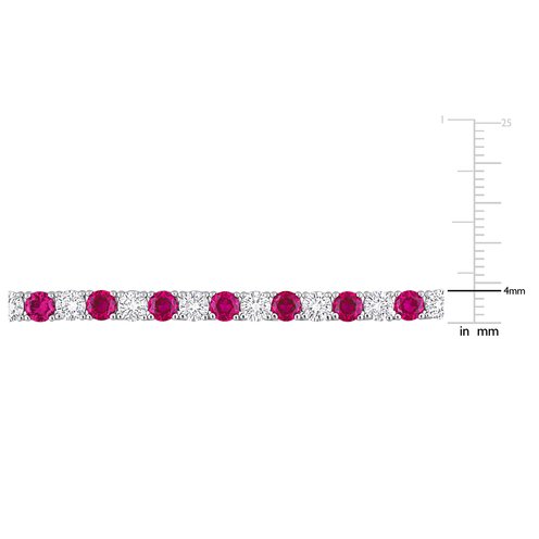 Pamper yourself with this attractive Tennis Necklace. Mounted in glistening sterling silver, this dainty necklace features 52 round-cut created ruby gemstones (4x4mm) and 51 round-cut created white sapphire gemstones (4x4mm) placed alternatively on the strand. This 17-inch necklace is secured with tongue and groove clasp. Polished to brilliance, this classy necklace will add sparkle to your favorite outfit.