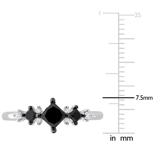 Elevate your style with the striking contrast of this 4/5ct TDW Black and White Princess and Round-Cut Diamond Three-Stone Ring in 14k White Gold. Three exquisite diamonds take center stage in this elegant ring, with a bold black princess-cut diamond flanked by two brilliant round-cut white diamonds. Set in lustrous 14k white gold, this ring exudes timeless sophistication and modern flair. The black and white diamonds create a captivating interplay of light and dark, making this piece a unique and eye-catching addition to your jewelry collection. Perfect for marking a special occasion or as a stunning statement piece, this ring combines classic elegance with contemporary design for a look that's both chic and unforgettable.