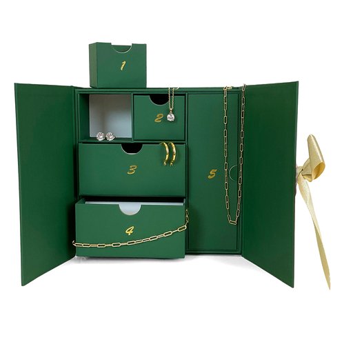 A stunning five-piece collection nestled in a festive gift green box with a golden ribbon, this advent treasure showcases glowing yellow plated sterling silver and timeless sparkle, featuring chic 20 mm polished hoop earrings, an on-trend paperclip chain necklace with matching bracelet, and brilliant created white sapphire studs and pendant that shimmer with every turn. The perfect blend of everyday luxury and holiday-ready radiance.