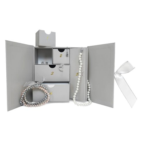 A luxurious five-piece pearl and sparkle set presented in a beautiful grey box with a silver ribbon, this advent treasure includes a trio of white, pink and grey cultured freshwater pearl stretch bracelets, a classic 16" strand of lustrous pearls with sterling silver clasp, polished sterling silver hoops, and dazzling created white sapphire stud and pendant designs. A radiant surprise waiting to be unwrapped.