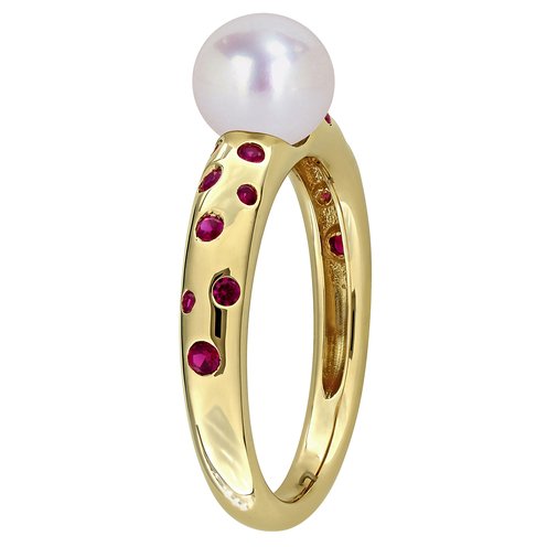 This elegant ring features a lustrous cultured freshwater pearl paired with a vibrant created ruby, set in warm 14K yellow gold. The timeless combination of rich color and classic design makes it a sophisticated choice for both everyday elegance and special occasions.