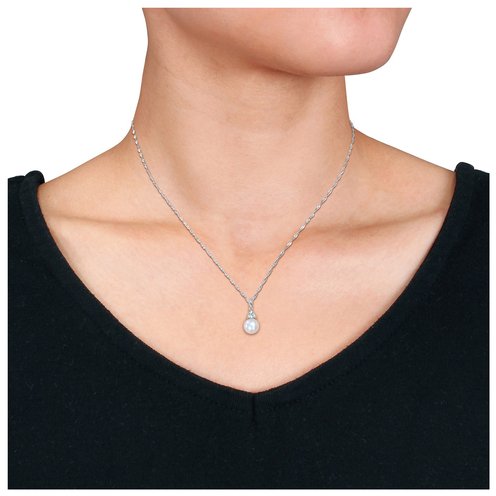 This elegant pendant features an 8�8.5mm cultured freshwater pearl paired with a serene 1/5 carat aquamarine gemstone. Set in luminous 10K white gold, the design captures a balance of classic sophistication and soft color. Suspended from a matching chain, it adds a graceful touch to both everyday wear and special occasions.
