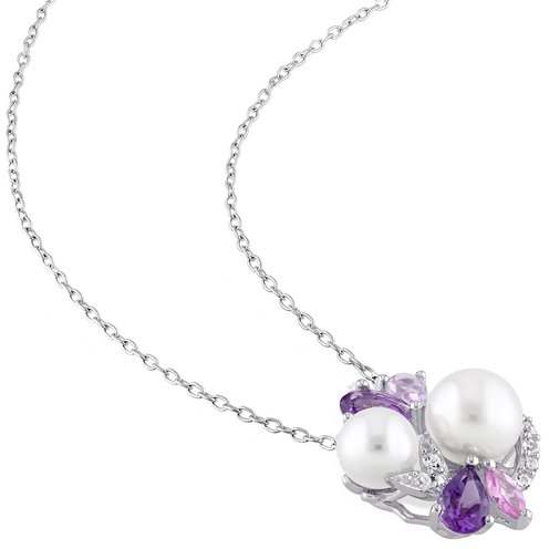 This charming necklace features freshwater round white pearls, created pink and white sapphires, amethyst and rose de france gemstones set in lustrous sterling silver. This lovely pendant is hung on a cable chain. Turn heads with this exquisite piece. Add some sophisticated spunk to her evening-ready wear with this fun and totally fashion-forward pearl and multi-shaped gemstone cluster pendant.