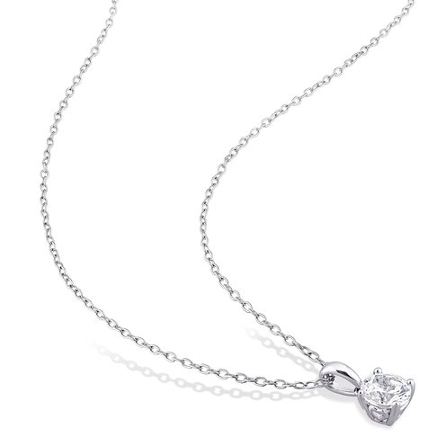 Make heads turn with this magnificent sapphire solitaire pendant with chain and stud earrings set. Crafted in lustrous sterling silver, this dazzling two-piece set features three round-cut, 4 prong-set, created white sapphire (6x6mm) gemstones in a classic heart design detail on earrings and pendant settings. Enhanced with a polished finish, the exquisite pendant is suspended on an 18-inch round cable chain secured with a spring-ring clasp, and the matching basic solitaire earrings are secured with butterfly closures. Versatile yet classy jewelry set for every woman.