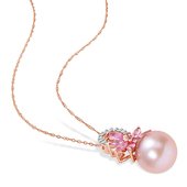 Get a breathtaking look with this Pink Freshwater Cultured Pearl, Pink Sapphire, and Diamond Pendant with Chain. Crafted in lustrous 14-karat rose gold, they feature a round, pink freshwater cultured pearls (9.5-10mm) crowned by six marquise-cut (5 x 2.5mm, 4 x 2mm) and three round-cut, prong-set pink sapphire gemstones (2 x 2mm, 1.5 x 1.5mm) as well as 13 round-cut, buttercup-set diamonds (G-H, I1-I2) adding sparkle. Polished to a brilliant shine, this pendant is suspended on 17-inch Singapore chain and secures with spring ring clasp. Be a showstopper with this bow pendant with chain for your next party.