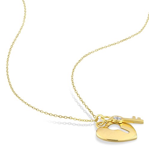 This unique heart lock and key charm with chain is crafted in lustrous yellow plated sterling silver. This elegant charm showcases four pave-set diamonds on the top of the key. Enhanced with a high polished finish, this classy charm is suspended on an 18-inch round cable chain. If you are somebody who likes to wear neckpieces on a daily basis, then this versatile piece is for you.