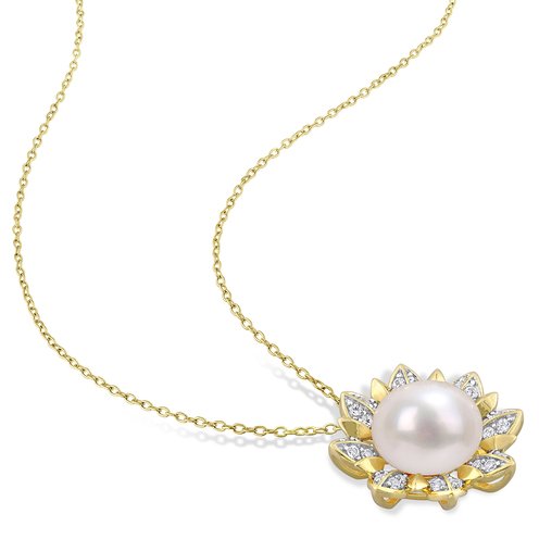 This pearl flower necklace is crafted in yellow plated sterling silver. This charming pendant features an 11.5-12 mm cultured freshwater pearl at the center along with 32 round-cut, pave-set white topaz gemstones in a unique marquise setting floral design. This modern piece of jewelry makes a perfect gift for yourself or for someone you love.
