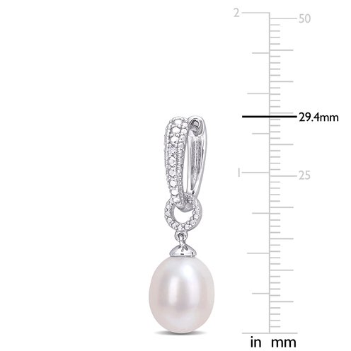 Jazz up your outfit with these Freshwater Cultured Pearl and Diamond Accent Dangle Hoop Earrings. Crafted in lustrous sterling silver, they feature two rice-shaped, freshwater cultured pearls (8-8.5mm) crowned by two round-cut, prong-set diamond accents (H-I, I3) on the closures. Enhanced with a high polish finish, these alluring pearl and diamond earrings are secured with clip-in closures. Coordinate these ravishing pearl and diamond dangle hoop earrings with any ensemble for a classy and stylish look.