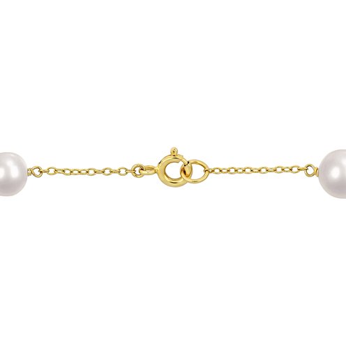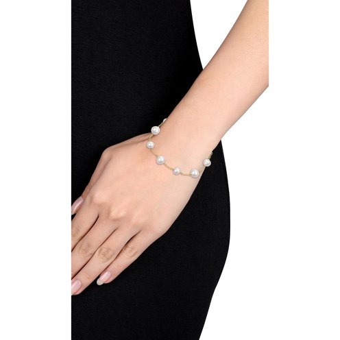 This pretty station bracelet is crafted in lustrous 18-karat yellow plated sterling silver. This classy bracelet showcases eight off round-shaped cultured freshwater pearls. Polished to a brilliant shine, this exquisite 7.25-inch bracelet is perfect for daily wear or can be saved for special occasions as well. Be the queen of elegance with this enchanting bracelet.
