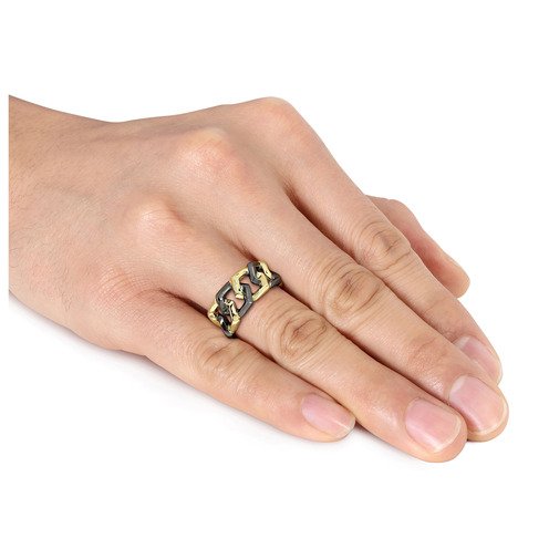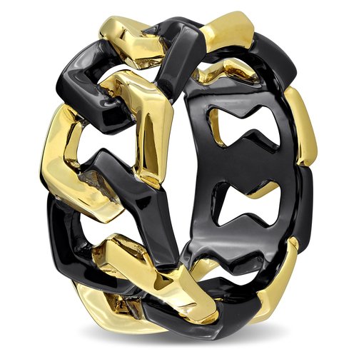 This modern hexagon link eternity ring features sleek hexagonal links set in yellow plated sterling silver, enhanced with black ruthenium for a bold, striking contrast. The combination of warm gold tone and dark black ruthenium creates a contemporary and edgy design, perfect for making a statement. The eternity style adds a sense of timeless elegance, making this ring a sophisticated piece for any occasion. A unique addition to any jewelry collection, blending modern style with classic appeal.