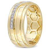 With a modern look, this sleek diamond ring brings contemporary appeal to his attire. Fashioned in sterling silver with yellow rhodium plate, this choice showcases a row of diamonds that slants along the center - artfully highlighted by raised sculpted details. Captivating with 1/10 ct. t.w. of diamonds and a bright polished shine, this design is just his style. Custom-made to fit his ring size.