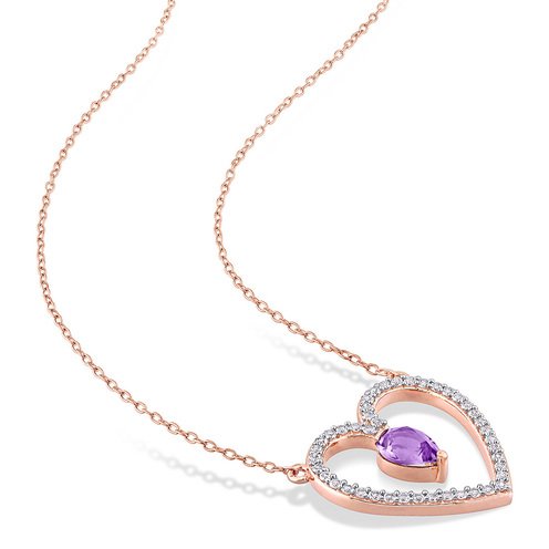 Get a breathtaking look with this Amethyst and White Topaz Open Heart Teardrop Necklace. Mounted in lustrous rose rhodium-Plating sterling silver, they feature a pear-cut, channel-set amethyst gemstone (7 x 5mm) studded under the heart design. Further 43 round-cut, prong-set white topaz gemstones are studded in a heart design. Polished to a brilliant shine, this pendant is suspended on a 17-inch round cable chain and secures with a spring ring clasp. Melt her heart with this enchanting heart teardrop necklace.