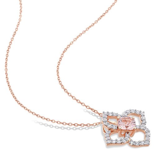 This sophisticated Morganite and White Topaz flower necklace is crafted in rose plated sterling silver. This stunning quatrefoil pendant features a cushion-cut, prong-set morganite surrounded by a halo of 36 round-cut white topaz gemstones in a unique floral design. Enhanced with a high polish finish, this gemstone necklace is the perfect addition to any jewelry collection.