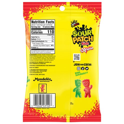 Soft & chewy candy. Per 12 Pieces: 110 calories; 0 g sat fat (0% DV); 25 mg sodium (1% DV); 22 g total sugars. Contains a bioengineered food ingredient. Super sour then sweet. Dude. Seriously? Made in Turkey.
