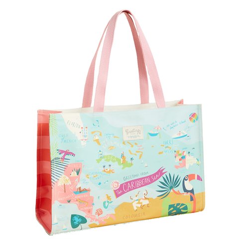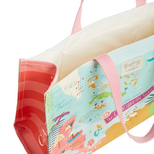 Our best-selling tote meets our best-selling map illustration patterns in our Greetings From Market Totes. Made of durable, easy-to-clean laminated cotton, throw the thick, cotton-webbed straps over your shoulder and head to the market or beach with your goodies stowed away in the roomy interior with one interior slip pocket.
