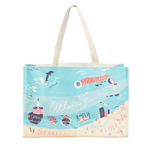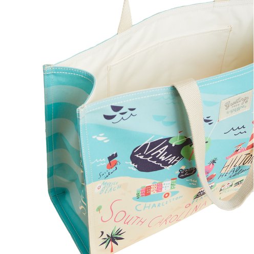 Our best-selling tote meets our best-selling map illustration patterns in our Greetings From Market Totes. Made of durable, easy-to-clean laminated cotton, throw the thick, cotton-webbed straps over your shoulder and head to the market or beach with your goodies stowed away in the roomy interior with one interior slip pocket.