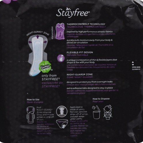 How to Use: Peel Night-guard zone adhesive strips and middle adhesive strip off of pad. Apply pad to inside of panty. Remove adhesive strips off of wings, and pull wings under panty. How to Dispose: Do not flush.