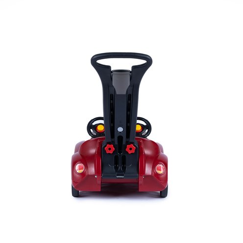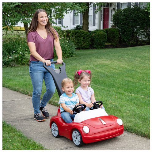 Turn your everyday walk into an epic adventure with the Side-by-Side Push Around Roadster™! Two toddlers can buckle into this ride-on car, grab the wheel, and get ready to roll. The sleek design, complete with realistic faux metal accents, headlights, working horns, and molded-in features, takes pretend play to the next level. The Whisper Wheels™ provide a quiet, smooth ride for the kids, while the EZ-turn caster wheel and wide grip handle provide easy steering and full maneuverability for the adult. Plus, the handle features a phone holder and a folding design that allows it to be tucked underneath the car body for compact storage and easy transportation. It's the perfect stroller alternative for going to the park, the zoo, or around the block. Made strong, durable, and easy-to-clean, this riding toy for two is ready to bring the fun for many years to come. Made in the USA.