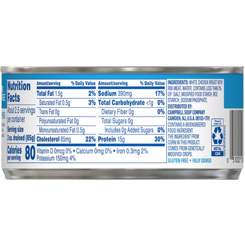 Chicken breast with rib meat packed in water. 15 g protein per 3 oz. serving. Gluten free. 98% fat free. No added MSG. Contains a bioengineered food ingredient. The ingredient from corn in this product comes from genetically modified crops. Fully cooked. Inspected for wholesomeness by U.S. Department of Agriculture.