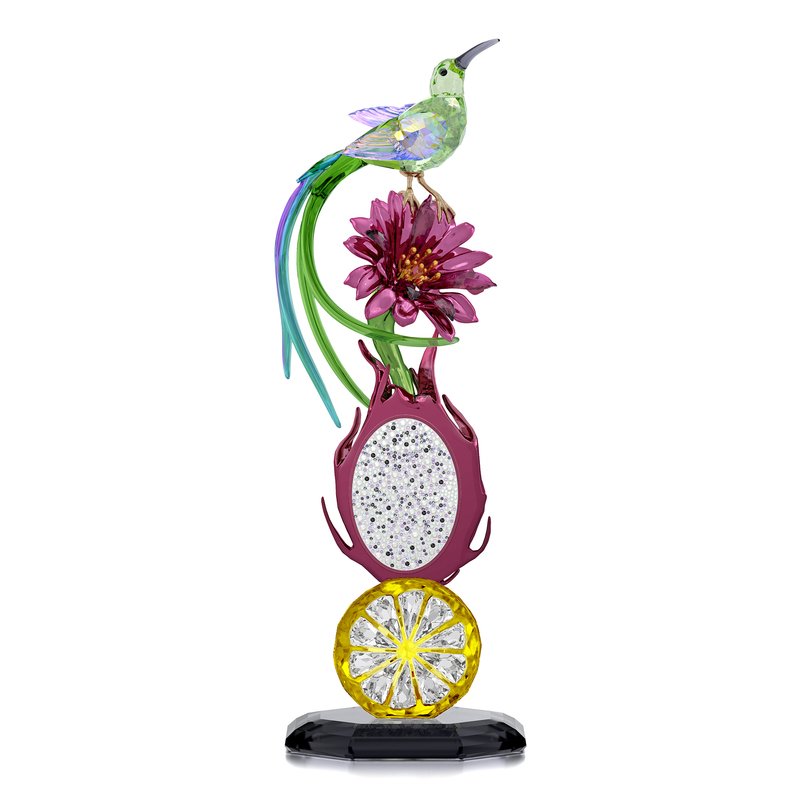Step into a world of natural wonder and marvel at the colors and exquisite savoir-faire of this masterful Swarovski totem. The tropical scene has been created with 939 precision-cut facets and around 671 crystals, each hand-set using the Pointiage® technique. A stunning display of craftsmanship that reveals a vibrant sugarbird sitting atop an exotic pink cactus flower, dragon fruit, and lemon. The creativity is further brought to life with glossy metal accents, a captivating Shimmer effect, and a graphite-colored base. Sheer beauty to awaken nature in your home. Decoration object. Not a toy. Not suitable for children under 15.