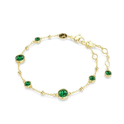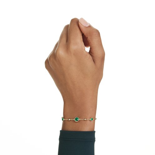 With its dynamic mix of shapes, this Imber bracelet will give your wrist a distinctive glow. The gold-tone plated chain features a lobster closure and a strand of metal droplets, interspersed with round green crystals in a refined bezel setting. The piece also includes an extra elongation, allowing it to fit all sizes. Perfect for adding a soft and graceful touch to an outfit. Since 1895, Swarovski has been committed to philanthropy and sustainability, continuously investing to preserve the environment and to positively impact global and local communities. In 2020, we initiated the largest transformation ever for our business, by fully integrating sustainability within our entire Swarovski Crystal Business. This allowed us to prepare for the challenges of the future and to strengthen our commitment towards our sustainability vision and company mission.