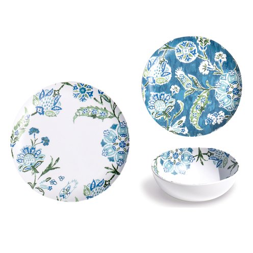 Durable break resistant melamine in a bright and cheery mix and match design.