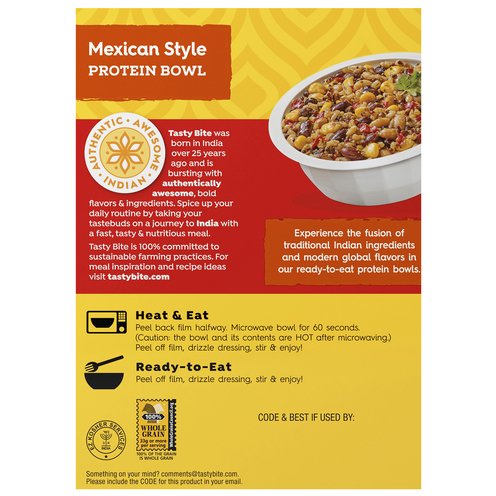 A medley whole grains and beans with a Mexican-style citrus cilantro vinaigrette. 12 g plant protein. 100% Whole Grain: 33 or more per serving. 100% of the grain is whole grain. wholegrainscouncil.org. Vegan. High fiber*. * 7 g total fat and 520 mg sodium per bowl. Non-GMO Project verified. nongmoproject.org. 60 secs. Mild. All natural. Authentic. Awesome. Indian. Tasty bite was born in India over 25 years ago ang is bursting with authentically awesome, bold flavors & ingredients. Spice up your daily routine by taking your tastebuds on a journey to India with a fast, tasty & nutritious meal. Experience the fusion of traditional Indian ingredients and modern global flavors in our ready-to-eat protein bowls. BPA-free microwavable bowl. tastybite.com. Tasty bite is 100% committed to sustainable farming practices. Product of India.