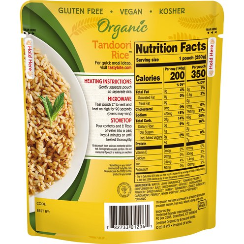 Long grain rice with aromatic Indian spices. USDA Organic. Gluten free. Vegan. Certified organic by Ecocert India. Non-GMO Project verified. Microwavable 90 seconds. Please include the code for this product in your email. BPA free. Product of India.