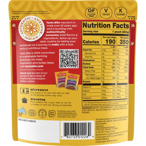 Restaurant-style steamed white rice. USDA Organic. Gluten free. Vegan. Certified Organic (NPOP) by Ecocert India Pvt Ltd (NPOP/NAB/002). Certified organic (NOP) by Ecocert. Non-GMO Project verified. 90 secs. Authentic. Awesome. Indian. Tasty Bite was born in India over 25 years ago and is bursting with authentically awesome, bold flavors & ingredients. Spice up your daily routine by taking your tastebuds on a journey to India with a fast, tasty & nutritious meal. For meal inspiration and recipe ideas visit Something on your mind? comments@tastybite.com. Please include the code for this product in your email. Tasty Bite is 100% commited to sustainable farming practices.BPA free. Eco Cert. Product of India.