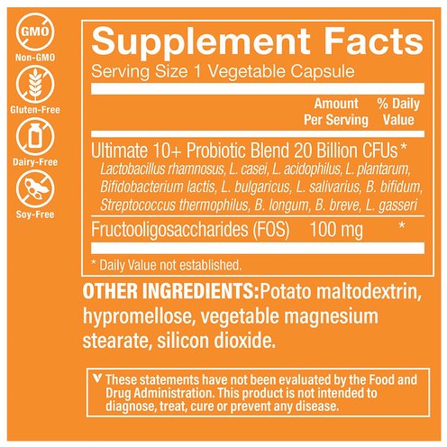 A happy gut makes a healthy you. Formulated to promote digestive, respiratory, and immune health, The Vitamin Shoppe® brand Ultimate 10+ Probiotic capsules have 20 billion CFUs of 12 beneficial probiotic strains, plus fructo-oligosaccharides to keep the good bacteria in your digestive tract fed and flourishing. Exemplifying convenience and quality, these once-daily vegetable capsules are verified by independent 3rd party labs for potency and purity.
