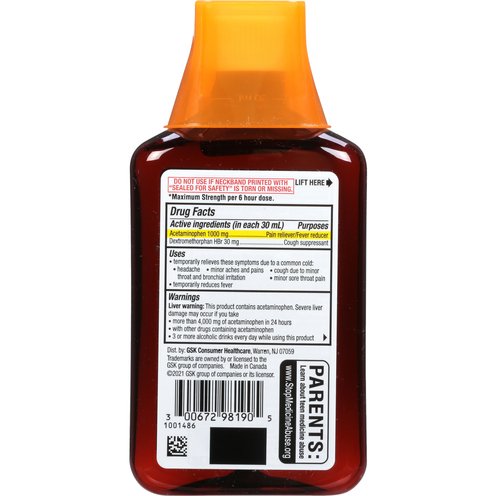In Each 30 mL Warnings: Liver Warning: This product contains acetaminophen. Severe liver damage may occur if you take: more than 4,000 mg of acetaminophen in 24 hours; with other drugs containing acetaminophen; 3 or more alcoholic drinks every day while using this product. Allergy Alert: Acetaminophen may cause severe skin reactions. Symptoms may include:: skin reddening; blisters; rash. If a skin reaction occurs, stop use and seek medical help right away. Sore throat warning: if sore throat is severe, persists for more than 2 days, is accompanied or followed by fever, headache, rash, nausea, or vomiting consult a doctor promptly. Do not use: in a child under 12 years of age; if you are allergic to acetaminophen; with any other drug containing acetaminophen (prescription or nonprescription). If you are not sure whether a drug contains acetaminophen, ask a doctor or pharmacist; if you are now taking a prescription monoamine oxidase inhibitor (MAOI) (certain drugs for depression. psychiatric or emotional conditions, or Parkinson's disease). or for 2 weeks after stopping the MAOI drug. If you do not know if your prescription drug contains an MAOI, ask a doctor or pharmacist before taking this product. Ask a doctor before use if you have: liver disease; a breathing problem such as emphysema or chronic bronchitis; cough that occurs with too much phlegm (mucus); cough that lasts or is chronic such as occurs with smoking, asthma or emphysema. Ask a doctor or pharmacist before use if you are: taking the blood thinning drug warfarin When using this product do not exceed recommended dosage. Stop use and ask a doctor if: pain or cough gets worse or lasts more than 7 days; fever gets worse or lasts more than 3 days; redness or swelling is present; new symptoms occur; cough comes back or occurs with rash or headache that lasts. These could be signs of a serious condition. If pergnant or breast-feeding, ask a health professional before use. Keep out of reach of children. In case of overdose, get medical help or contact a Poison Control Center right away. Prompt medical attention is critical for adults as well as for children even if you do not notice any signs or symptoms. Do not use if neckband printed with sealed for safety is torn or missing.