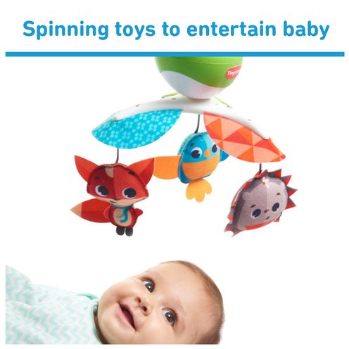 The Meadow Days™ Take-Along Mobile is designed to support your baby’s development at home or on the go. The engaging black and white contrasts and colorful hanging toys spin to provide visual stimulation and fine motor skill development for your little one. Babies can practice their communication and language skills while lying in their crib or sitting in their stroller by cooing at the smiling characters. The mobile’s clever design makes it easy to attach to most play yards, strollers, and bassinets, making it the perfect travel toy. The mobile also features 30 minutes of 5 different melodies to help soothe and amuse your little one at home or on the go.