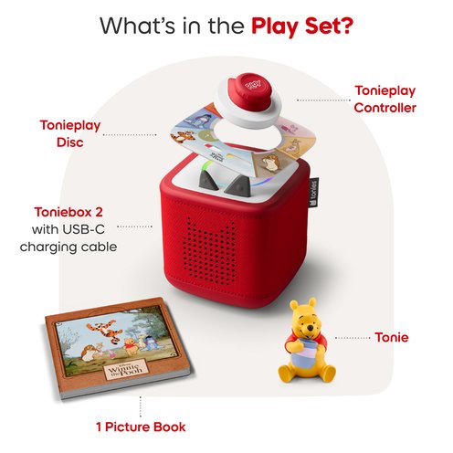 - Everything they need to listen, grow and play in a whole new way with Toniebox 2. This Play Set comes with a Disney Winnie the Pooh Tonie figurine, the Disney Winnie the Pooh: Tigger's Mix-Up Fix-Up Tonieplay game and a Sunset Red Toniebox 2.