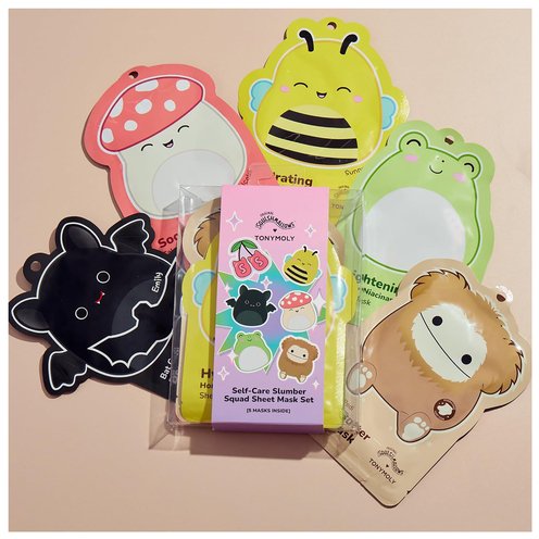 Treat yourself to the ultimate self-care experience with this adorable TONYMOLY x Squishmallows Self-Care Slumber Squad Sheet Mask Set! This delightful collection features 5 unique sheet masks, each decorated with charming Squishmallows characters. The set includes a depuffing bat-shaped eye patch, a soothing sheet mask, a hydrating mask, a brightening mask, and a nourishing foot mask.
