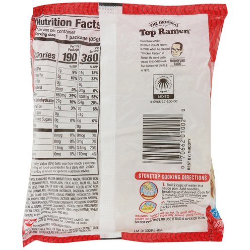 Contains bioengineered food ingredients. The original. No added msg (contains small amounts of naturally occurring glutamates). Momofuku Ando invented instant ramen in 1958, when he created chicken ramen in Japan. He went on to create the original top ramen for the U.S. in 1970. RSPO: Certified sustainable palm oil. Mixed.
