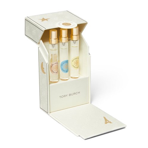 A little extra shine for the holidays. This Tory Burch gift set comes with a limited-edition keepsake box, featuring gold-embossed charms of Tory's favorite things, from poodles—inspired by her own Chicken and Slim—to iconic locations. Carry your favorites from the