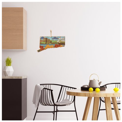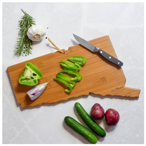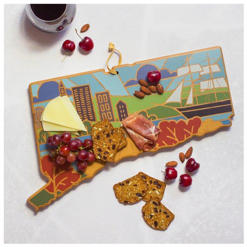 Celebrate life in The Constitution State with the Totally Bamboo Connecticut State Shaped Cutting Board with Artwork by Summer Stokes. This Connecticut shaped board features beautiful landscape art by artist Summer Stokes. It's a fun way to add a bit of "local flavor" to your next charcuterie or grazing board. Before serving, flip the board over for use as a knife-friendly bamboo chopping board on the blank back side. When not in use, the included hang tie allows the board to easily double as wall art. Show off your love of Connecticut in your kitchen, dining room, den or office. The Connecticut Cutting Board with Artwork by Summer Stokes is a great gift idea for anyone on your list that loves Connecticut. The artwork is applied using a specialized UV printing technique that's safe for food contact and will maintain its beautiful color. Caring for the board is easy; simply hand wash with warm water and soap. Do not soak or wash in the dishwasher. Board measures 16-1/2" x 9-1/2" x 5/8".