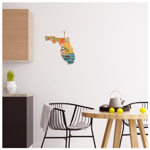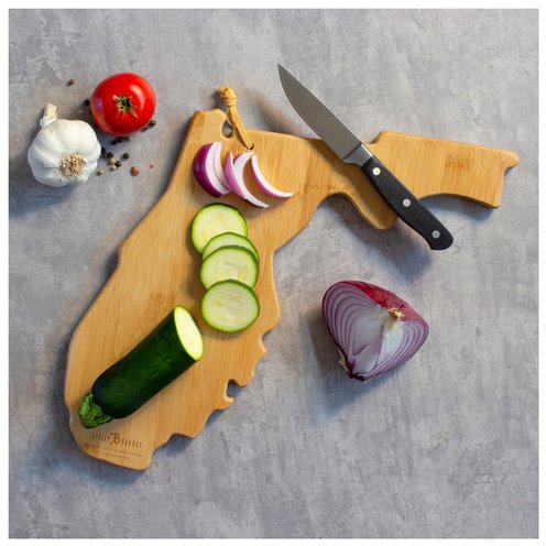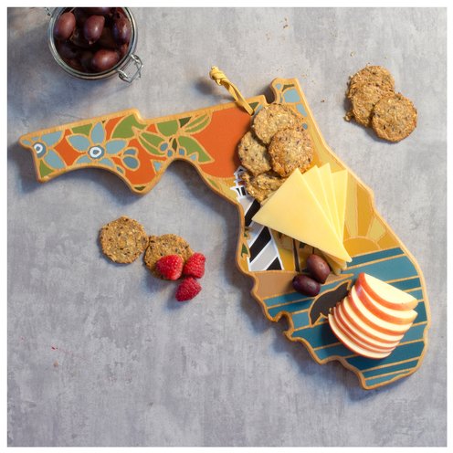 Celebrate life in The Sunshine State with the Totally Bamboo Florida State Shaped Cutting Board with Artwork by Summer Stokes. This Florida shaped board features beautiful landscape art by artist Summer Stokes. It's a fun way to add a bit of "local flavor" to your next charcuterie or grazing board. Before serving, flip the board over for use as a knife-friendly bamboo chopping board on the blank back side. When not in use, the included hang tie allows the board to easily double as wall art. Show off your love of Florida in your kitchen, dining room, den or office. The Florida Cutting Board with Artwork by Summer Stokes is a great gift idea for anyone on your list that loves Florida. The artwork is applied using a specialized UV printing technique that's safe for food contact and will maintain its beautiful color. Caring for the board is easy; simply hand wash with warm water and soap. Do not soak or wash in the dishwasher. Board measures 13-1/2" x 12-1/4" x 5/8".