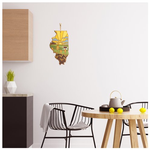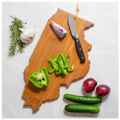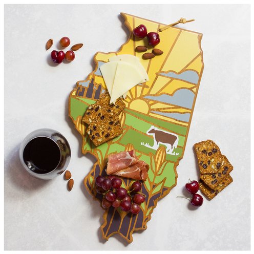 Celebrate life in The Land of Lincoln with the Totally Bamboo Illinois State Shaped Cutting Board with Artwork by Summer Stokes. This Illinois shaped board features beautiful landscape art by artist Summer Stokes. It's a fun way to add a bit of "local flavor" to your next charcuterie or grazing board. Before serving, flip the board over for use as a knife-friendly bamboo chopping board on the blank back side. When not in use, the included hang tie allows the board to easily double as wall art. Show off your love of Illinois in your kitchen, dining room, den or office. The Illinois Cutting Board with Artwork by Summer Stokes is a great gift idea for anyone on your list that loves Illinois. The artwork is applied using a specialized UV printing technique that's safe for food contact and will maintain its beautiful color. Caring for the board is easy; simply hand wash with warm water and soap. Do not soak or wash in the dishwasher. Board measures 9-1/4" x 16-1/2" x 5/8".