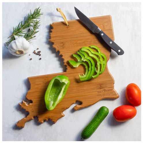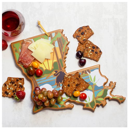 Celebrate life in The Pelican State with the Totally Bamboo Louisiana State Shaped Cutting Board with Artwork by Summer Stokes. This Louisiana shaped board features beautiful landscape art by artist Summer Stokes. It's a fun way to add a bit of "local flavor" to your next charcuterie or grazing board. Before serving, flip the board over for use as a knife-friendly bamboo chopping board on the blank back side. When not in use, the included hang tie allows the board to easily double as wall art. Show off your love of Louisiana in your kitchen, dining room, den or office. The Louisiana Cutting Board with Artwork by Summer Stokes is a great gift idea for anyone on your list that loves Louisiana. The artwork is applied using a specialized UV printing technique that's safe for food contact and will maintain its beautiful color. Caring for the board is easy; simply hand wash with warm water and soap. Do not soak or wash in the dishwasher. Board measures 13" x 12" x 5/8".
