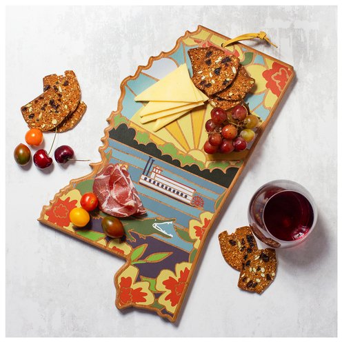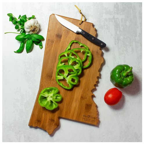 Celebrate life in The Magnolia State with the Totally Bamboo Mississippi State Shaped Cutting Board with Artwork by Summer Stokes. This Mississippi shaped board features beautiful landscape art by artist Summer Stokes. It's a fun way to add a bit of "local flavor" to your next charcuterie or grazing board. Before serving, flip the board over for use as a knife-friendly bamboo chopping board on the blank back side. When not in use, the included hang tie allows the board to easily double as wall art. Show off your love of Mississippi in your kitchen, dining room, den or office. The Mississippi Cutting Board with Artwork by Summer Stokes is a great gift idea for anyone on your list that loves Mississippi. The artwork is applied using a specialized UV printing technique that's safe for food contact and will maintain its beautiful color. Caring for the board is easy; simply hand wash with warm water and soap. Do not soak or wash in the dishwasher. Board measures 9-3/4" x 16-1/2" x 5/8".