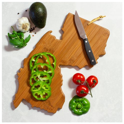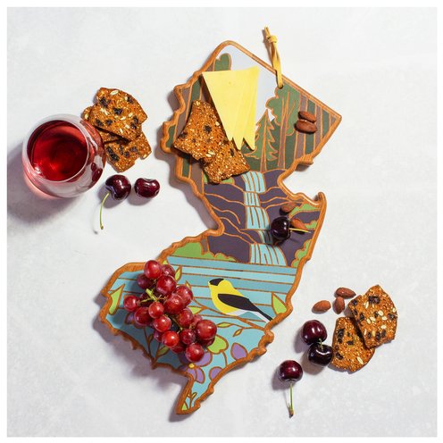Celebrate life in The Garden State with the Totally Bamboo New Jersey State Shaped Cutting Board with Artwork by Summer Stokes. This New Jersey shaped board features beautiful landscape art by artist Summer Stokes. It's a fun way to add a bit of "local flavor" to your next charcuterie or grazing board. Before serving, flip the board over for use as a knife-friendly bamboo chopping board on the blank back side. When not in use, the included hang tie allows the board to easily double as wall art. Show off your love of New Jersey in your kitchen, dining room, den or office. The New Jersey Cutting Board with Artwork by Summer Stokes is a great gift idea for anyone on your list that loves New Jersey. The artwork is applied using a specialized UV printing technique that's safe for food contact and will maintain its beautiful color. Caring for the board is easy; simply hand wash with warm water and soap. Do not soak or wash in the dishwasher. Board measures 8-5/8" x 16-5/8" x 5/8".