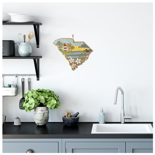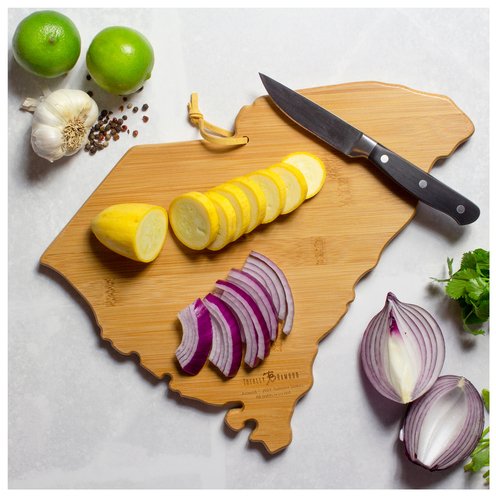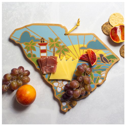 Celebrate life in The Palmetto State with the Totally Bamboo South Carolina State Shaped Cutting Board with Artwork by Summer Stokes. This South Carolina shaped board features beautiful landscape art by artist Summer Stokes. It's a fun way to add a bit of "local flavor" to your next charcuterie or grazing board. Before serving, flip the board over for use as a knife-friendly bamboo chopping board on the blank back side. When not in use, the included hang tie allows the board to easily double as wall art. Show off your love of South Carolina in your kitchen, dining room, den or office. The South Carolina Cutting Board with Artwork by Summer Stokes is a great gift idea for anyone on your list that loves South Carolina. The artwork is applied using a specialized UV printing technique that's safe for food contact and will maintain its beautiful color. Caring for the board is easy; simply hand wash with warm water and soap. Do not soak or wash in the dishwasher. Board measures 14" x 11-1/2" x 5/8".