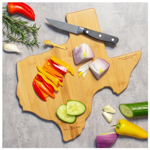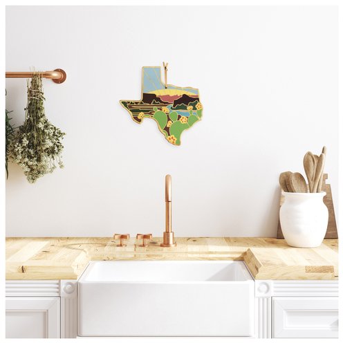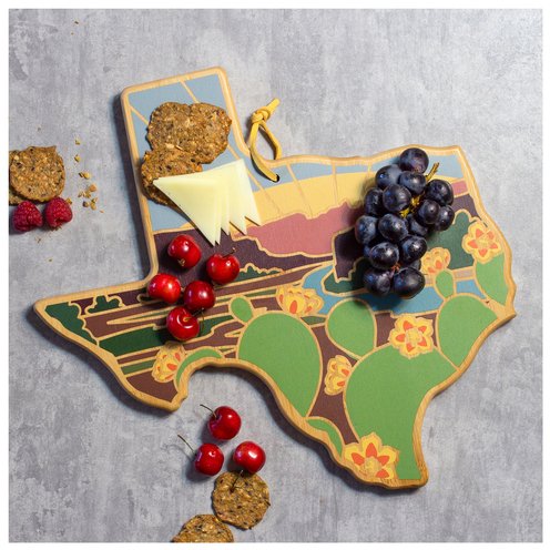 Celebrate life in The Lone Star State with the Totally Bamboo Texas State Shaped Cutting Board with Artwork by Summer Stokes. This Texas shaped board features beautiful landscape art by artist Summer Stokes. It's a fun way to add a bit of "local flavor" to your next charcuterie or grazing board. Before serving, flip the board over for use as a knife-friendly bamboo chopping board on the blank back side. When not in use, the included hang tie allows the board to easily double as wall art. Show off your love of Texas in your kitchen, dining room, den or office. The Texas Cutting Board with Artwork by Summer Stokes is a great gift idea for anyone on your list that loves Texas. The artwork is applied using a specialized UV printing technique that's safe for food contact and will maintain its beautiful color. Caring for the board is easy; simply hand wash with warm water and soap. Do not soak or wash in the dishwasher. Board measures 14" x 13-3/8" x 5/8".